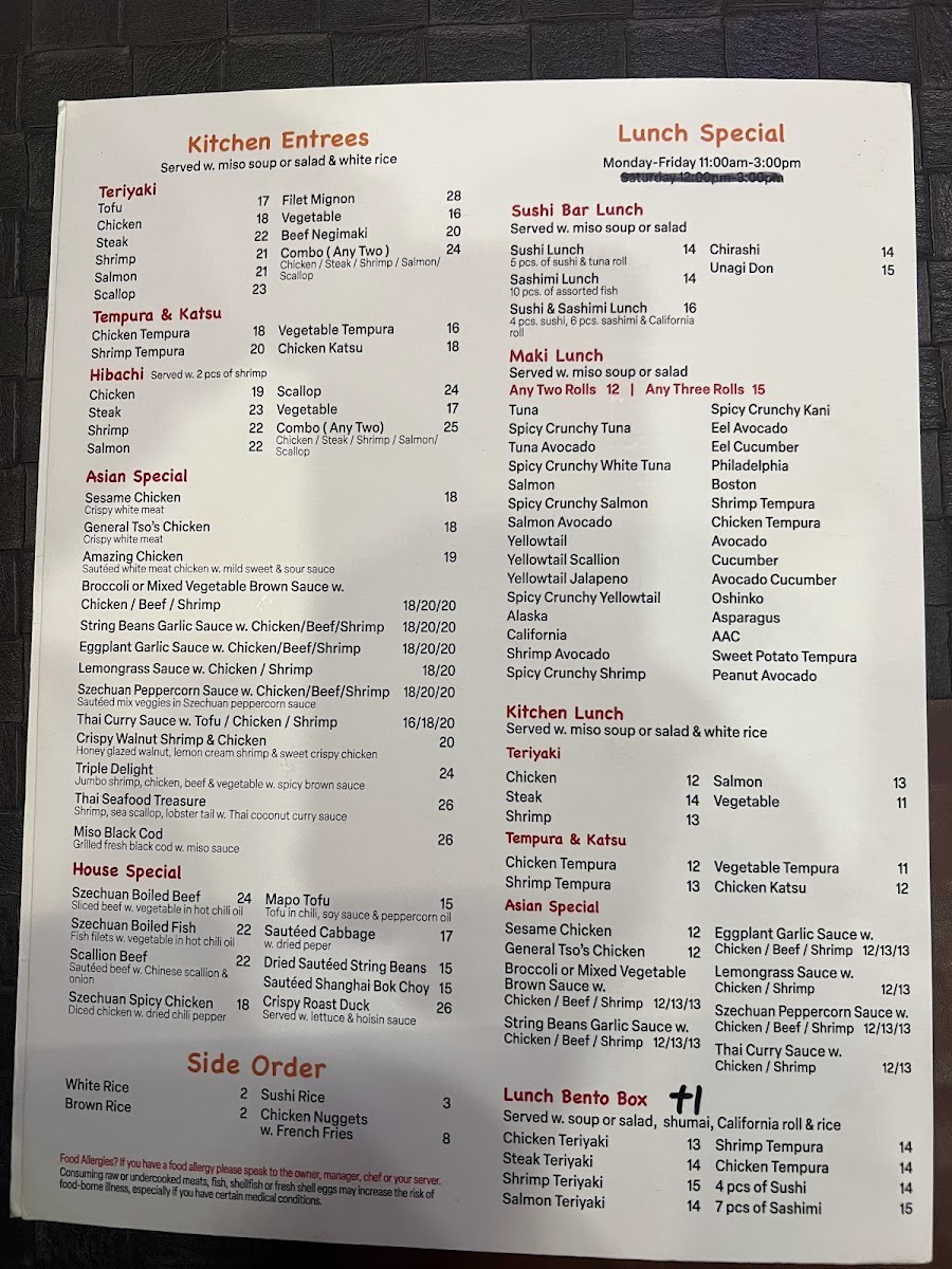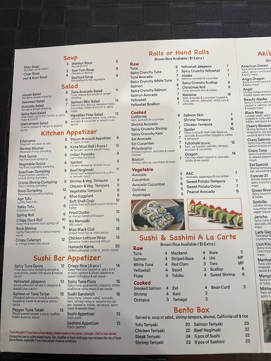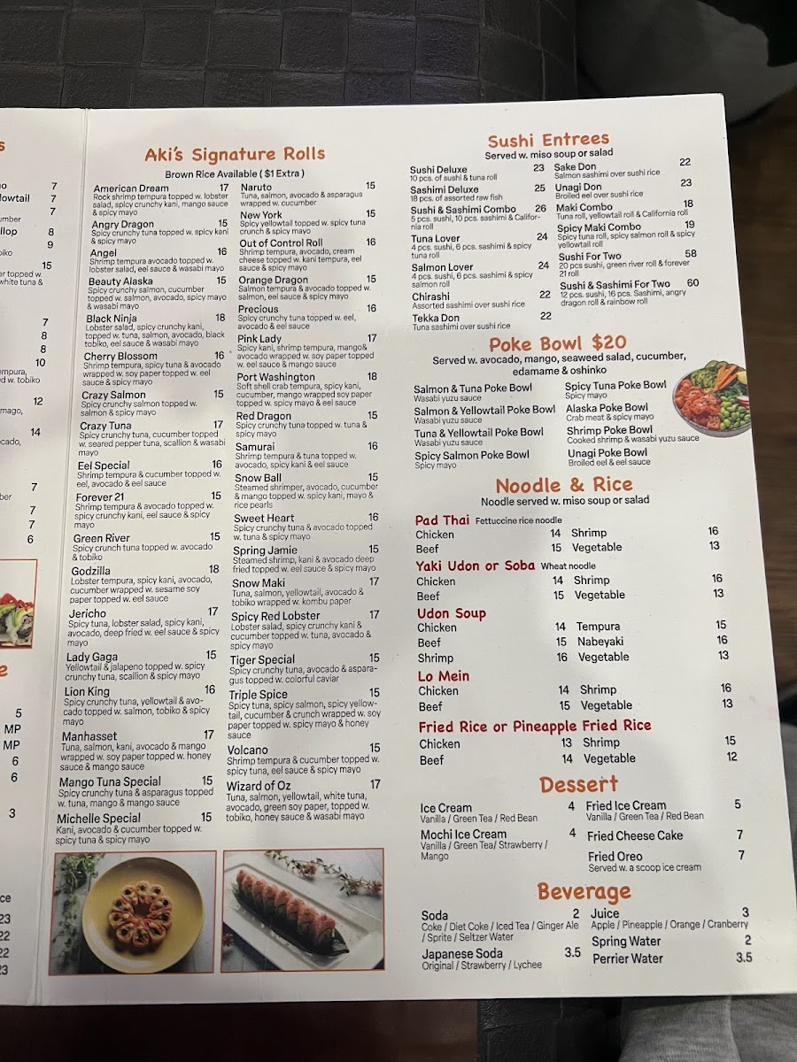 Overall, Aki Sushi & Asian Fusion presents a broad and well-rounded menu that caters to every taste, from fresh sushi and sashimi to hearty hibachi dishes and flavorful Asian specials, making it an excellent choice for lunch or dinner.